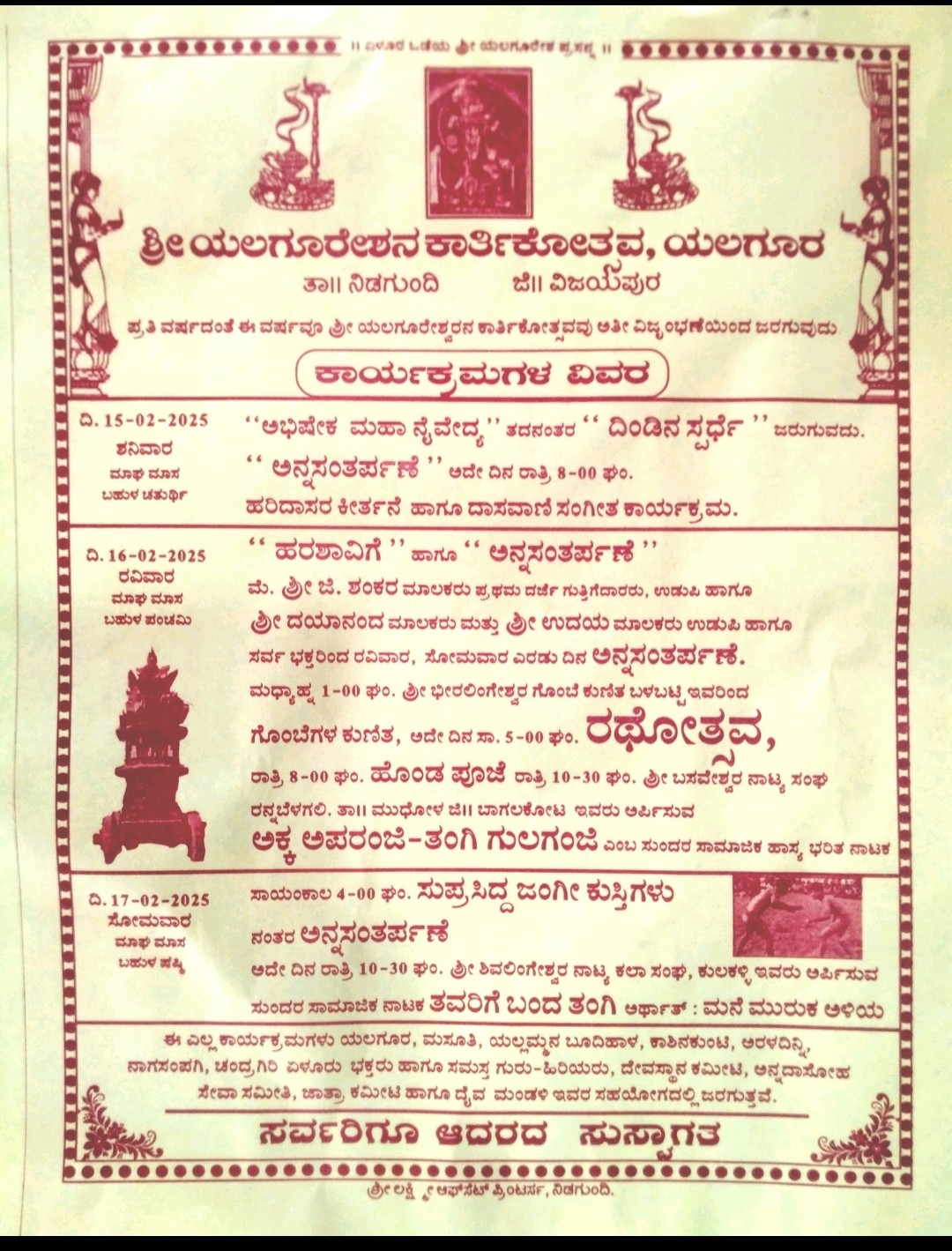 Shri Yalguresh committee hereby invites the devotees to come and perform seva to Shri Yalguresh and take his blessings in the Kartikotsava.